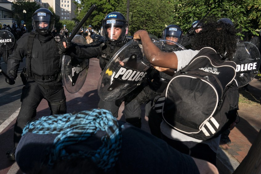 WASHINGTON, DC – JUNE 1: Police clash with protesters during a demonstration on June 1, 2020 in Washington, DC. Thousands of protesters took to the streets throughout Washington to continue to show anger after the death of George Floyd while in police custody in Minneapolis. Police officer Derek Chauvin was filmed kneeling on Floyd’s neck before he was later pronounced dead at a local hospital. Floyd’s death, the most recent in a series of deaths of black Americans at the hands of police, has set off days and nights of protests across the country. (Photo by Joshua Roberts/Getty Images)